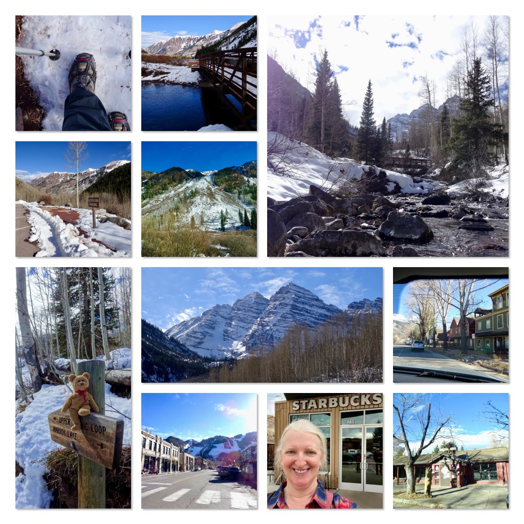 To be honest, today was part planning and a lot of luck. We were hoping to hike at Maroon Bells. To get to the trailhead before the end of October, you either need a permit for the car (which are very limited) or you have to ride a shuttle bus, which requires a level of pre-planning. After 1 November, there is no bus and parking is available, first come, first served. The road also usually closes by mid November, with the first snowfall, as it isn’t ploughed and becomes available for snowmobiles. As we drove up, signs said the this would be closed from 20th onwards, so just two more days of use. Last week’s snow still sat at the sides of the road, but the road itself was dry and clear.
