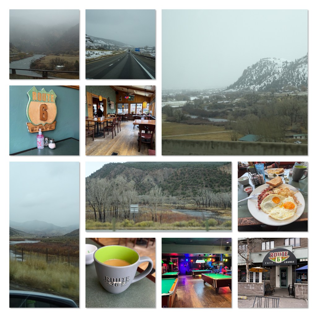 Hunger got the better of us and in looked on Google for a nearby diner. Route 6 diner in Vail sounded like it might be suitable l, and we detoured off I-70 to find it (yes, it’s located on route 6, in case you were wondering). This turned out to be a complete gem. It has both a cafe and bar, was very authentically eclectic and served great food. The coffee was even better. Once we were replete, though, we moved along, mindful of the weather.
