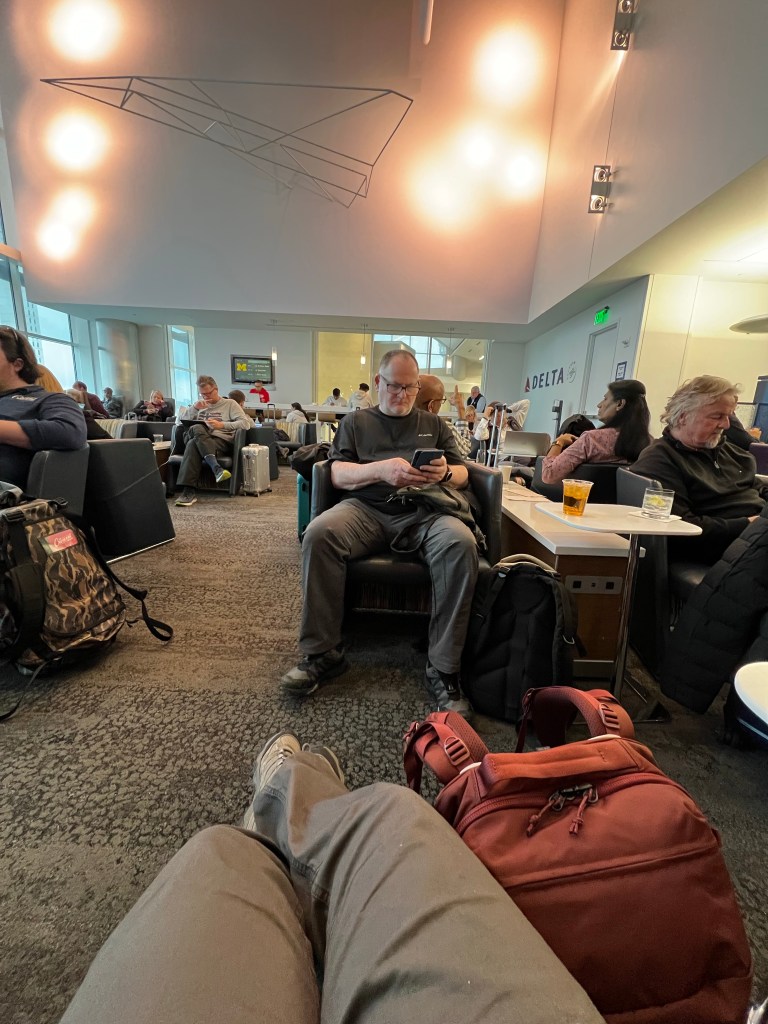 We made our way to the Delta lounge, only to find there was a queue for that too, due to it being full to capacity. This was because it was raining and the sky deck was closed. We only waited about 10 minutes though, before a departing flight resulted in some people leaving and we were able to go in. And there we sat for our remaining hours before boarding, availing ourselves of the drinks and snacks, reading our books and generally waiting for departure.