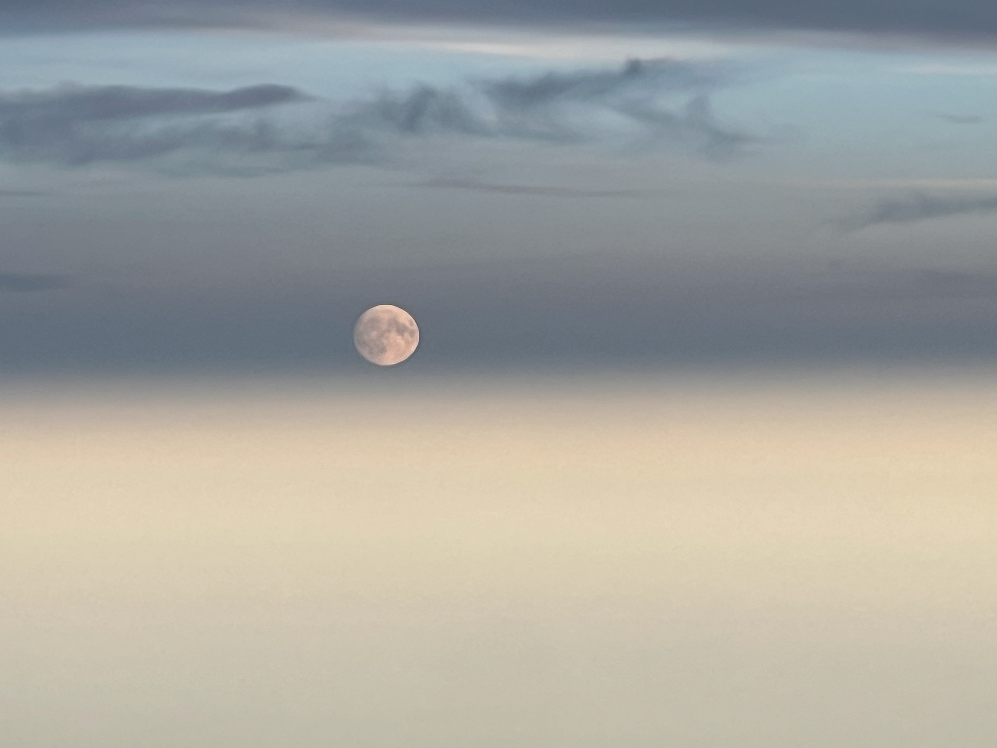 The plane seemed to be only about two thirds full, we pushed back on time and made our way south west in a level of light haze. We reached our cruising altitude of 38,000 feet, and were served coffee despite some ‘light turbulence’. The pilot left the fasten seatbelt sign off at first before resorting to turning it on, but conditions smoothed out after a while. We started our descent somewhere over the North Sea, and crossed over land with about 25 minutes to go. It was shortly after that, that I spotted the moon rising above the high cloud layer, tinted pink by the setting sun. It was, quite simply, wow.