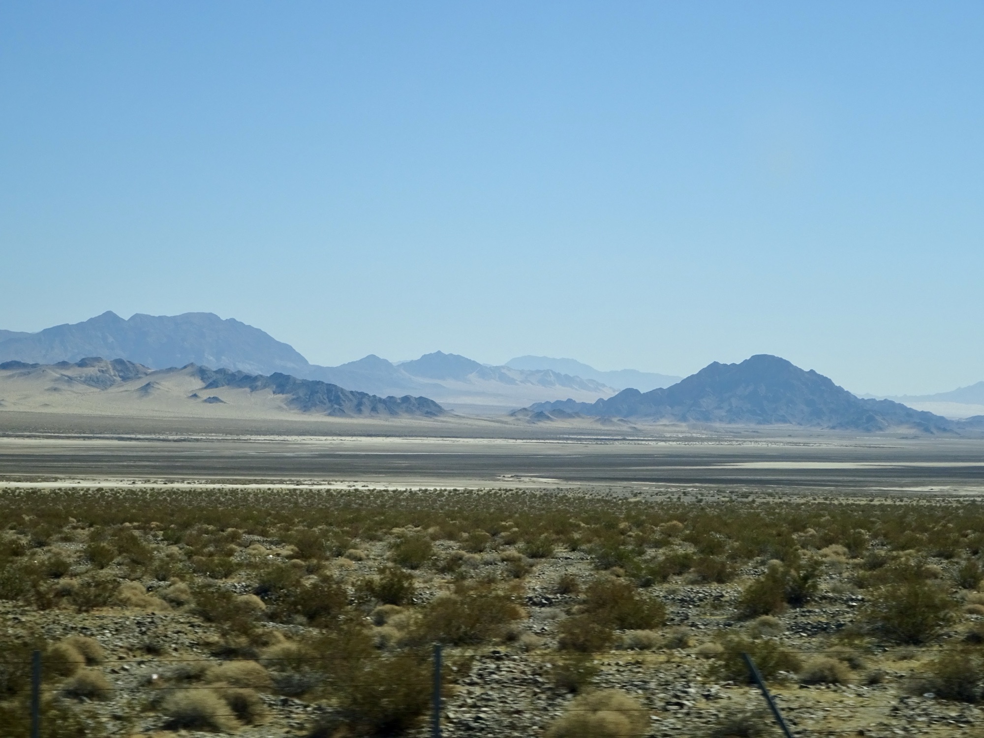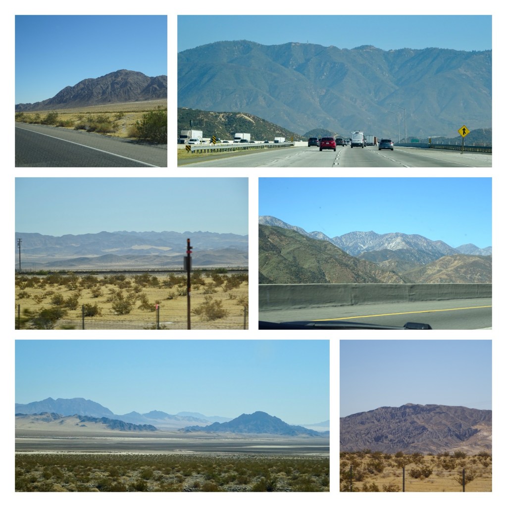 Getting on the I-10 was easy, and the traffic was busy but moving ok. We came off one exit too early for I-15, and that resulted in a little trip around the neighbourhood, but we soon got back on track and, with just a ten minute pit stop in Baker, we would arrive at the Premium Outlet mall some 200 miles and 3.5 hours later. The drive over was through some of the desert we’d flown over yesterday. First of all the route climbed over a mountain pass, summiting at nearly 5,000 feet. It’s hard to comprehend that these mountains, and all the sloping rock, have been created by the force of the Pacific plate sliding under North America. The highway then went through areas where the harder, black rock (volcanic, I’m guessing) is slowly being seen as the softer sandstone is eroded away, creating mini islands of rock within the sea of sand. It was all very beautiful in a desolate, desert way.