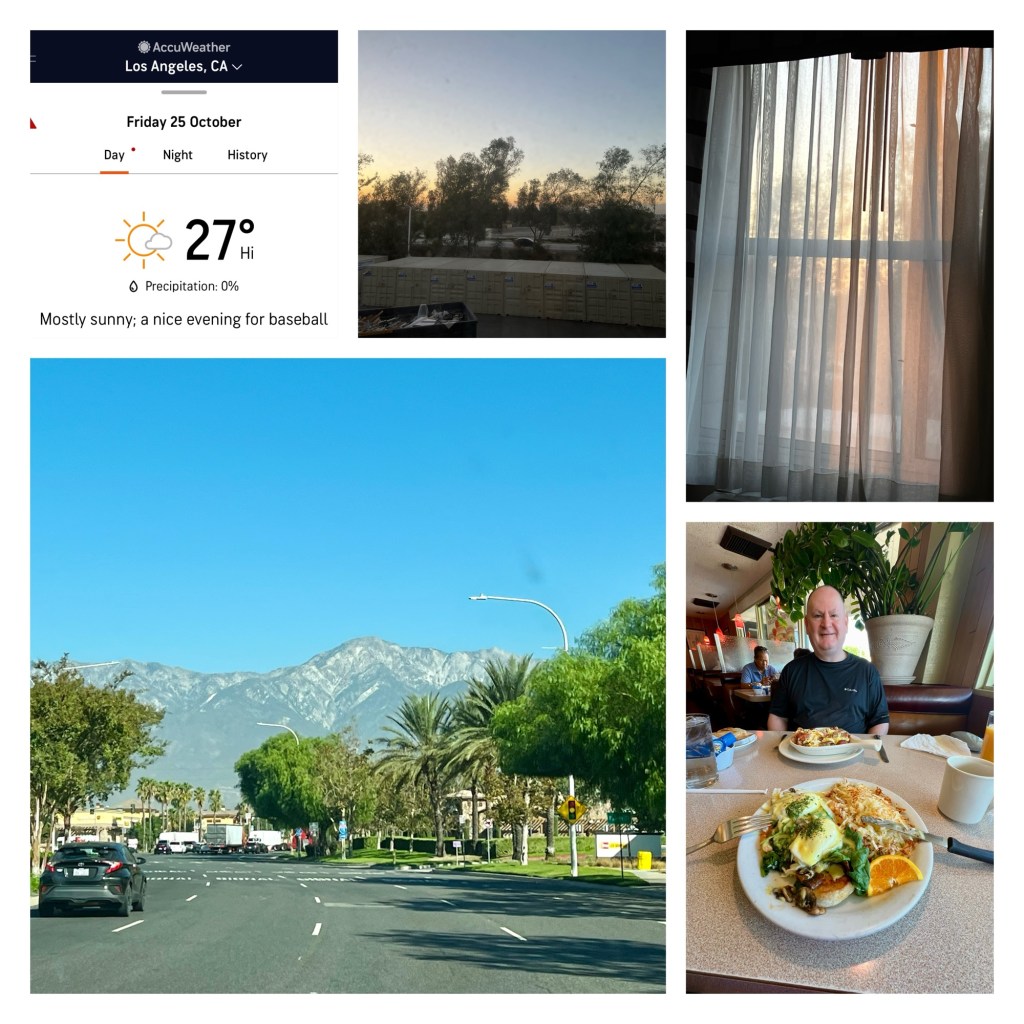 “What time is it?”, came a voice. “Almost 7am”, I replied, “and I was going to wake you up then anyway”. I’d been awake since 0515, tried to sleep until 6am, gave up, and spent some time fixing an app on my watch that insisted on telling me the weather at home, rather than where I am now. Twenty minutes of trying, failing, then uninstalling and reinstalling resulted in the satisfaction of success. It’s apparently currently 12 degrees, but going to get up to 30 later today. I listened to aircraft taking off, the occasional horn of American trains on the nearby rail line, and the gradually increasing traffic on the road (but which at least sounded like it was moving at speed).