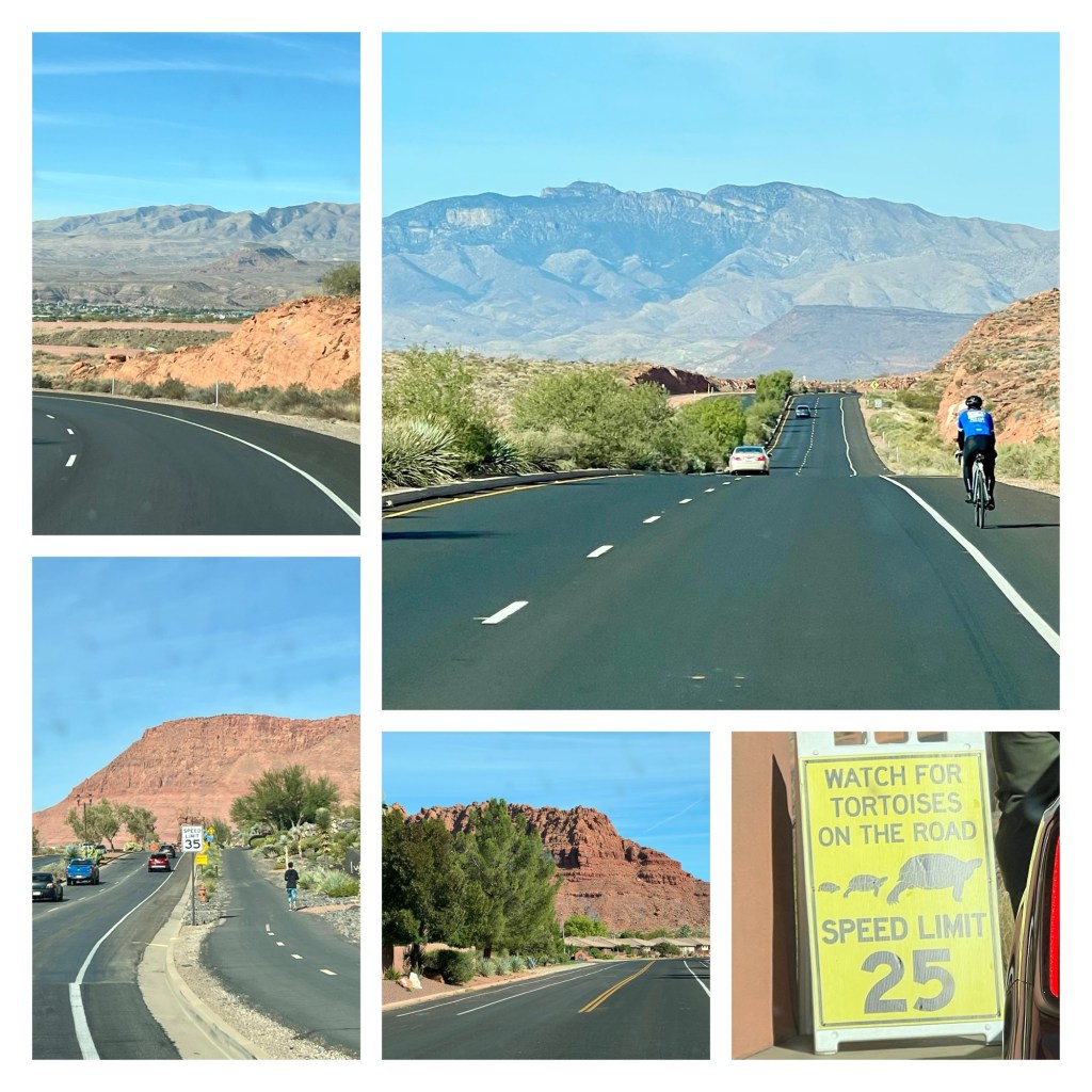 We drove through the red hills to Snow Canyon. Along the way we passed a lot of cyclists who were riding up to 100 miles as part of the Fall Tour…rather them than me. It is hilly as well as hot (6,810 feet of elevation gain along the course). At the entrance station there was a caution sign about tortoises. I’m not sure if the speed limit was for us, or if they have very fast tortoises, but we didn’t see any.