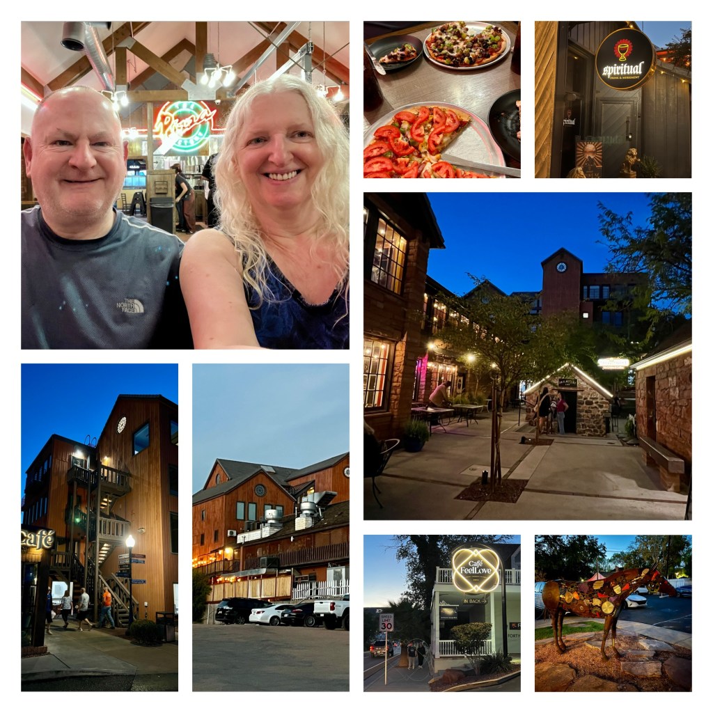 After showering and changing, we headed to Ancestor Square. St. George was founded in 1847, and these buildings date from the 1850s, as far as I can tell. They now function as a collection of bars and restaurants, and the atmosphere was relaxed and enjoyable on a pleasantly warm (77 degrees still, but the sun had set) Saturday evening. We went to the Pizza Factory, were lucky to get seated straight away, and the pizza itself was extremely tasty. Perfect choice.