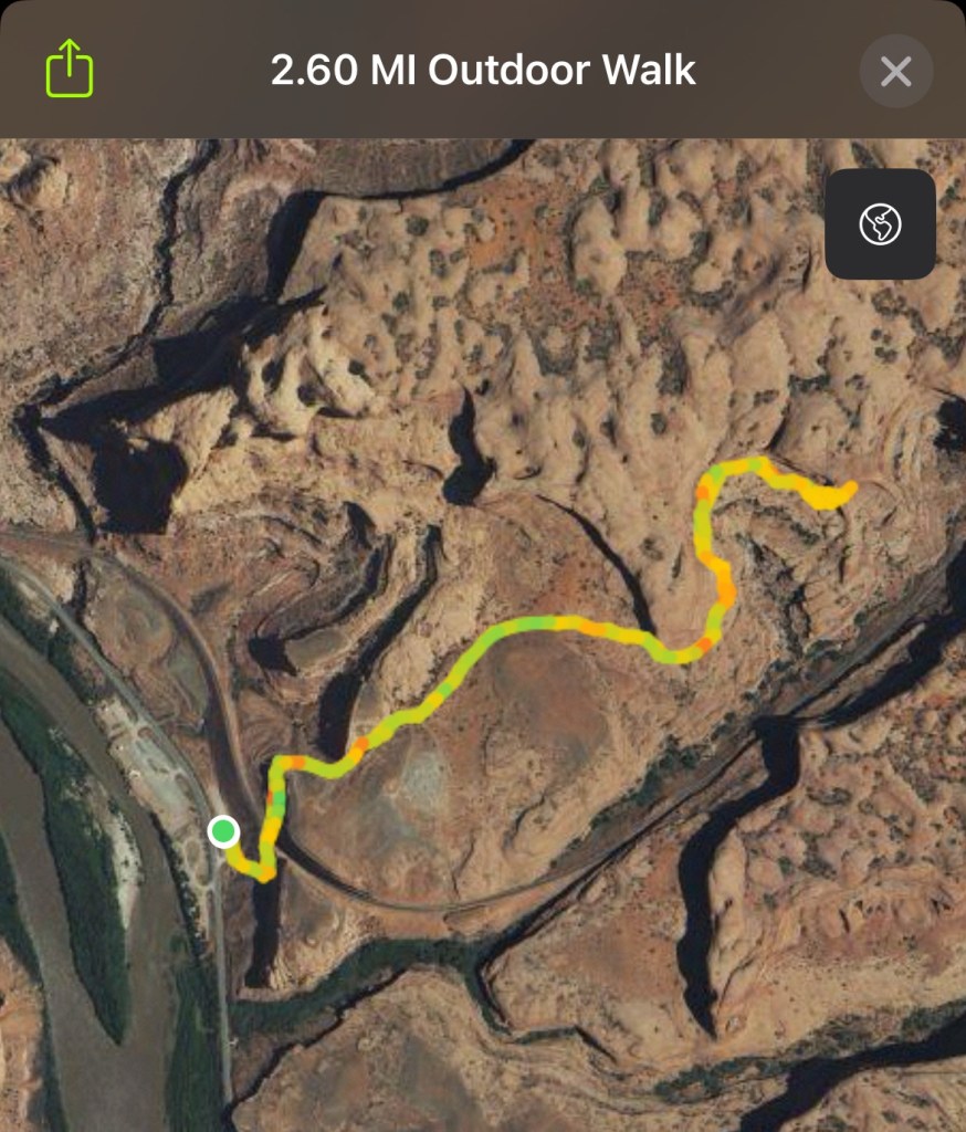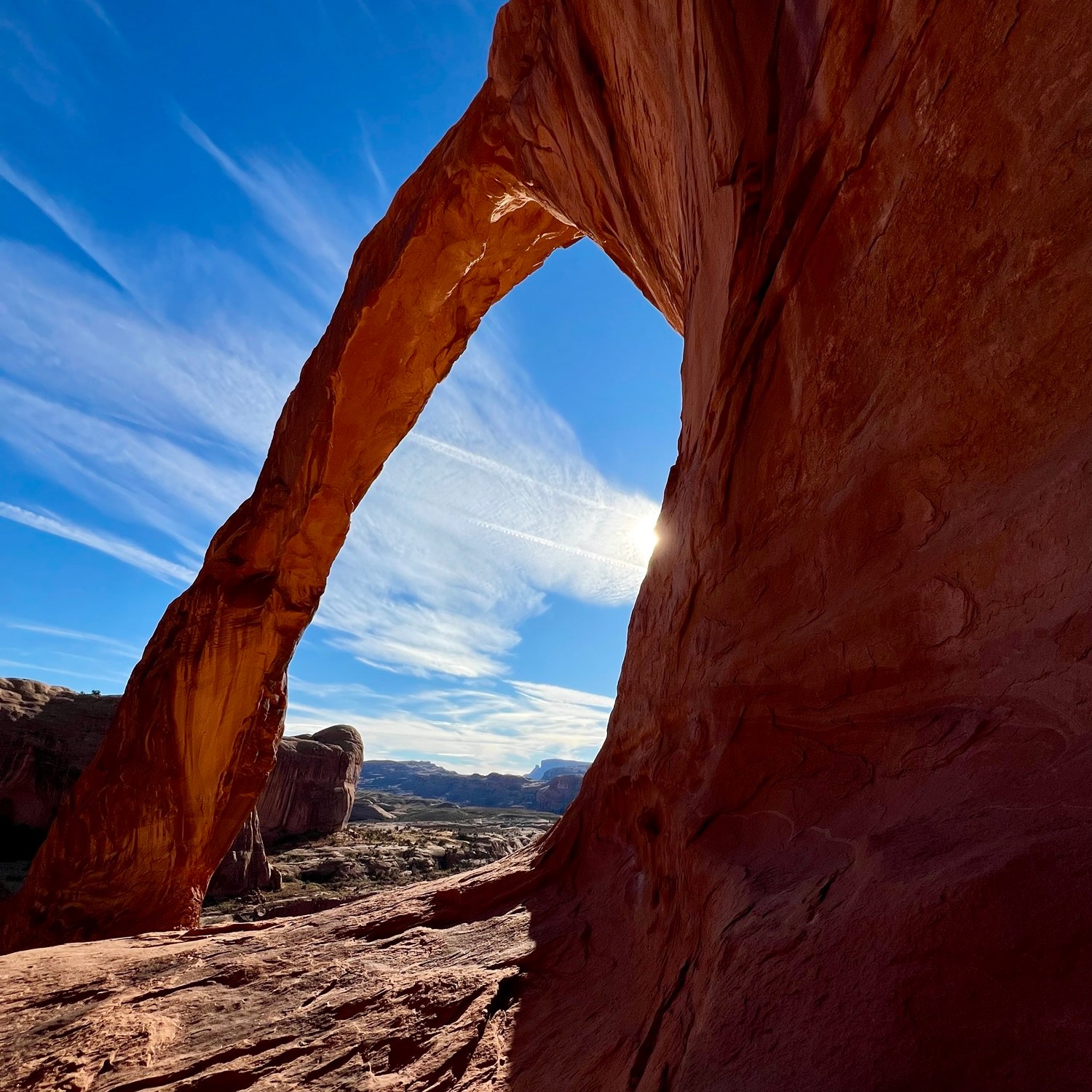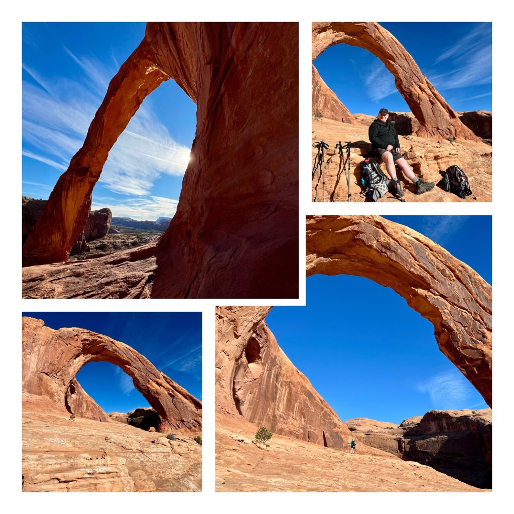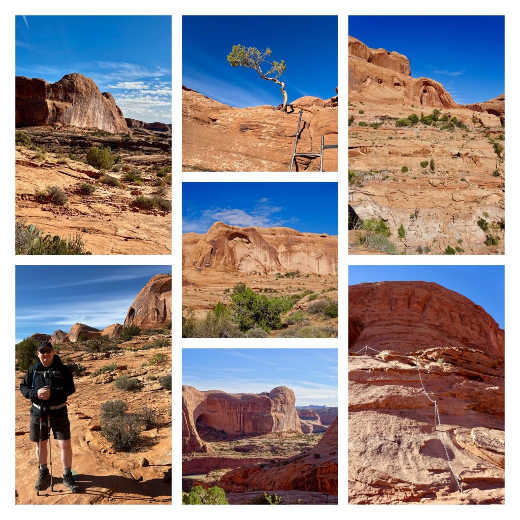 Andrew had requested something easy so we settled on Corona Arch Trail, which is only 3 miles long. It might be short, but parts of it were significantly more effort than might have been anticipated. Ah well. It started by crossing the railway line and then climbing up and over some slick rock. On occasion this was steeply sloping, and there was one section with a metal rope to climb, and a short ladder section. The view from the arch was worth the effort though.