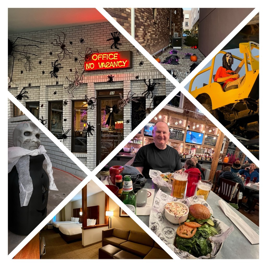 We checked in and decided that, because we were tired, and it was already gone six, we’d go straight out for dinner, then we could come back and relax. We walked into town, to the Spoke restaurant, passing funny Halloween decorations along the way. I remembered that last year, Spoke has done us the best coleslaw I’d ever had. Happy to confirm that they still do. And with that, I’m going to sleep.