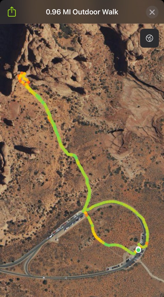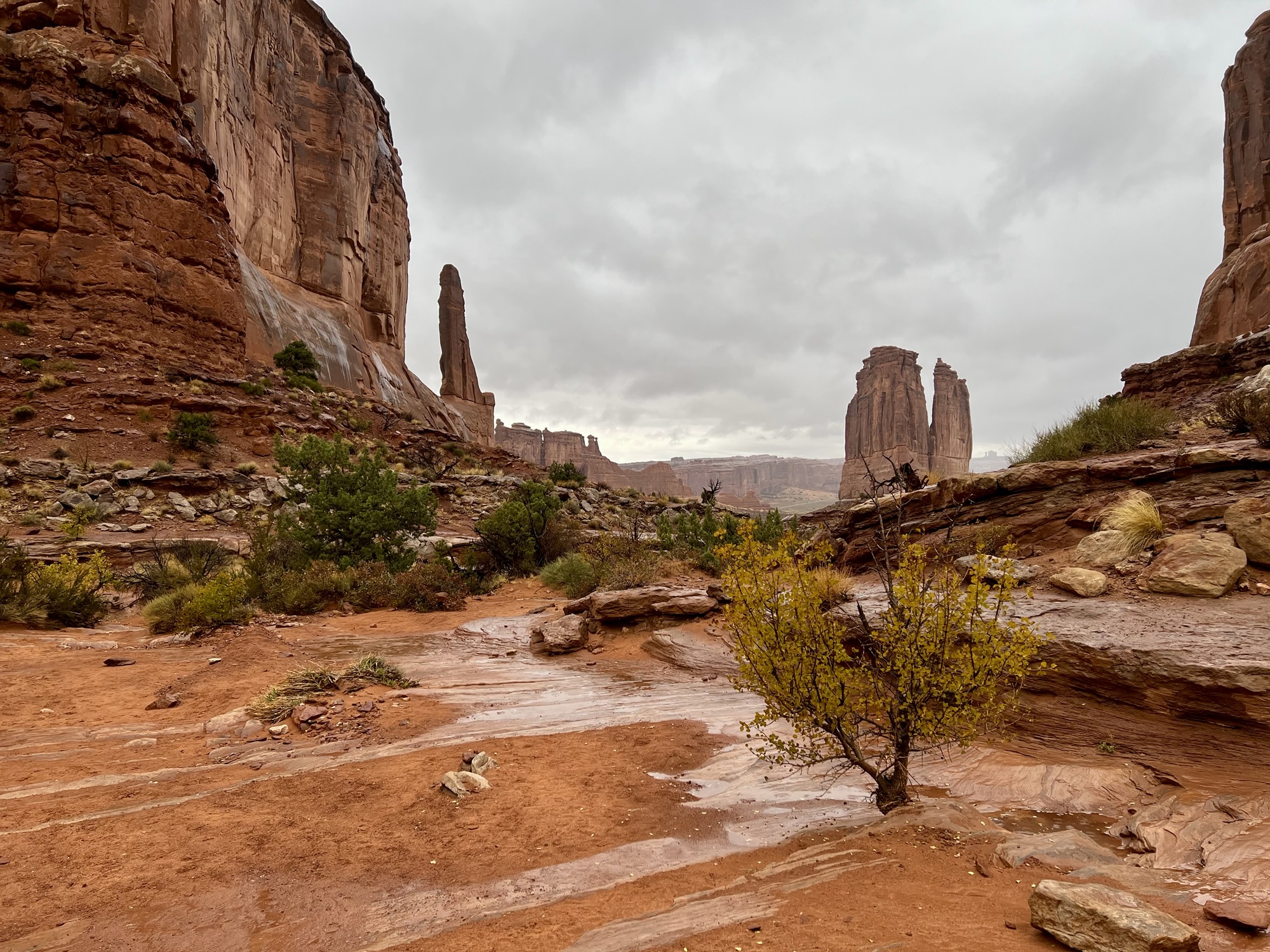 Gloria’s is an easy going place, with a range of food from breakfast, to salads, to sandwiches and burgers, to full dinners, and today was quite busy, mostly with people dressed in outdoor clothing, apparently putting off the outdoors. After a suitable lunch, however, we eventually headed for a hike. Our chosen option, out of several plans I’d developed, was to go to Arches and hike Park Avenue, one of our favourite short walks, with a hike up and down a (usually) dry wash, between towering red cliffs of Wingate sandstone.