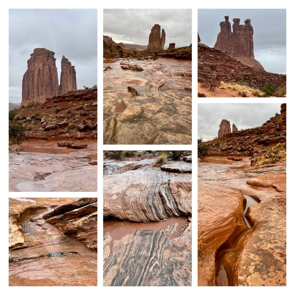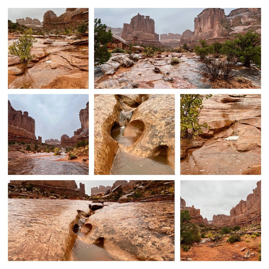Admittedly, from a scenery prospective, this is more glorious in the sunshine, but it was still impressive in the rain. In fact, it was great fun, and curiously interesting, watching the water for a stream down the wash, puddles getting bigger as time passed, and the steam forging a path across the wet sand. It definitely added another perspective to a route we’ve walked many times.