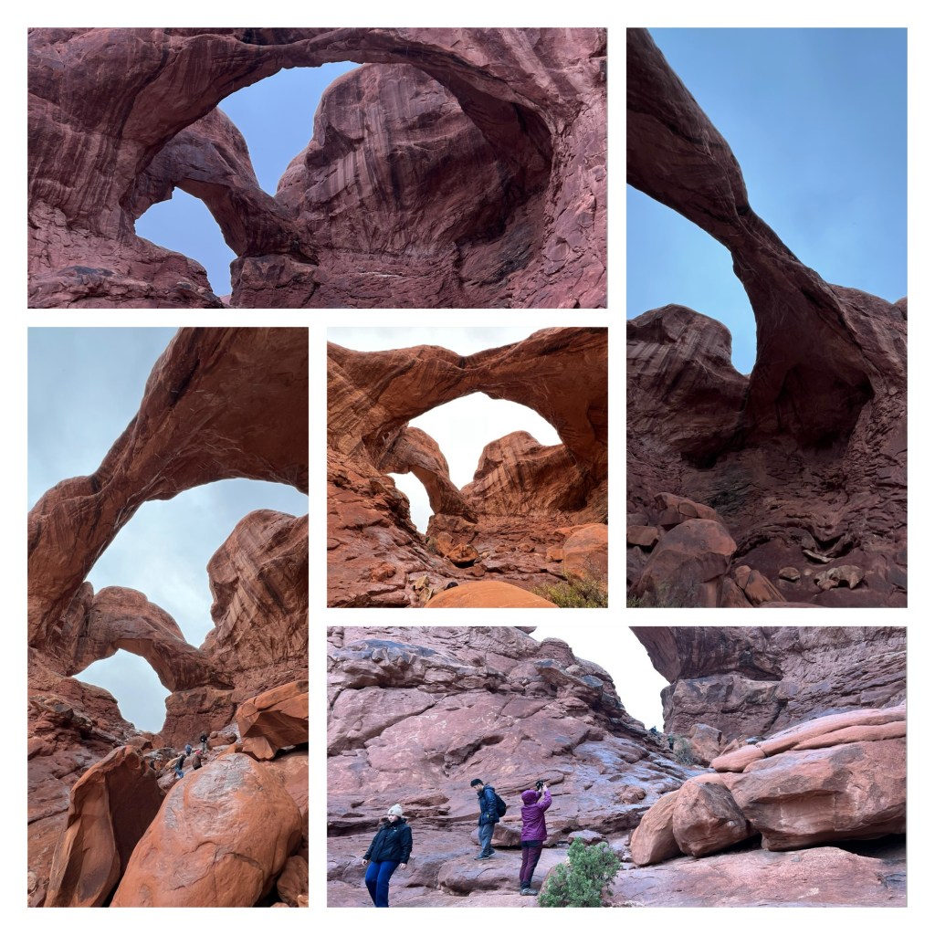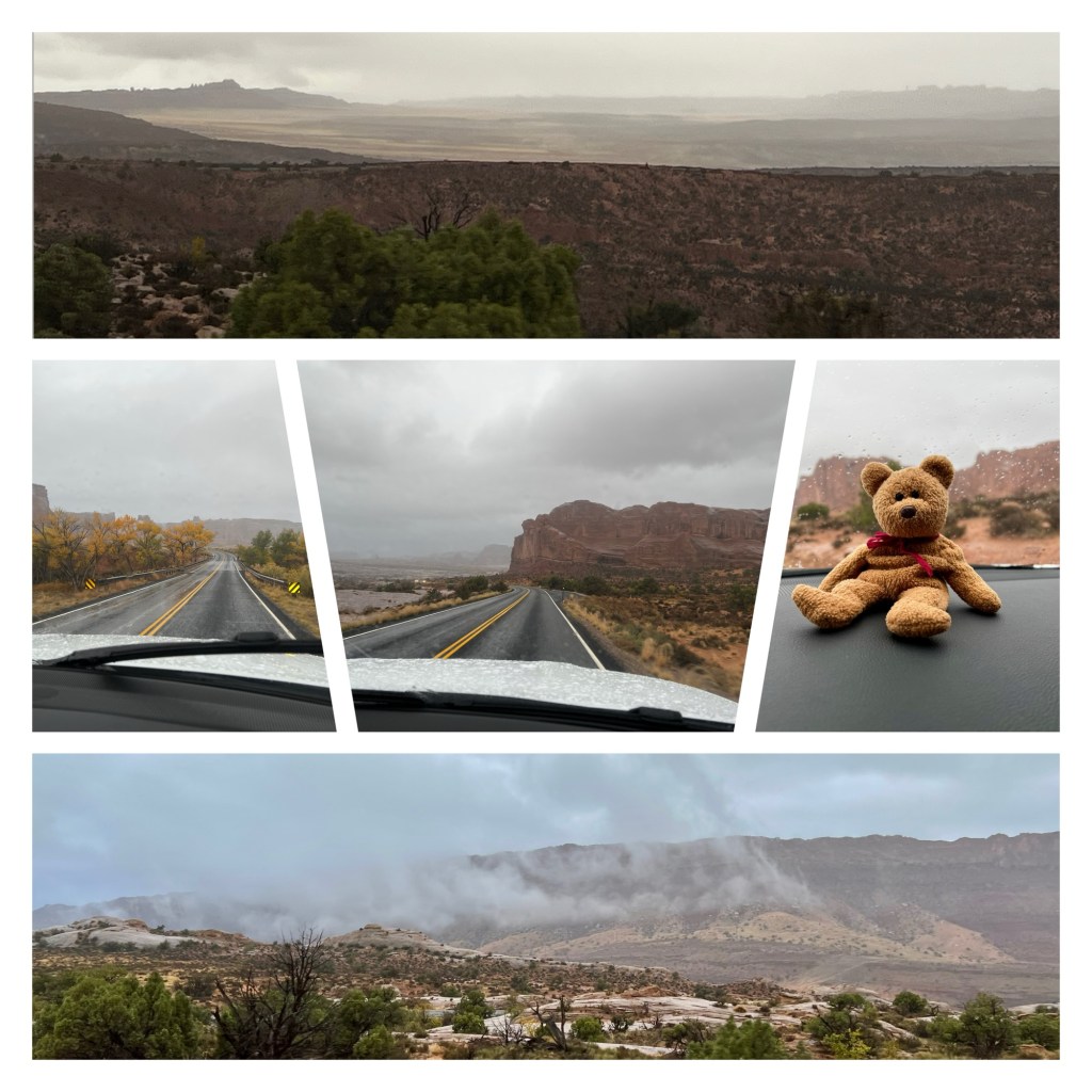 We then went to the Windows section and walked to Indiana Jones arch, more properly named Double Arch (it’s in the Last Crusade opening sequence). It’s big. Very big. It was also wet. Very wet. Whereas the rain had been fairly light but persistent while we walked Park Avenue, it was now heavier and persistent, and cold (37 degrees). We decided that we’d done enough and, given the weather was closing in even more, we’d pass on a daylight walk to Turret Arch and instead sit in the car, drink our tea and have some chocolate. We drove back out of the park, which was getting gloomier by the minute and back to the hotel.