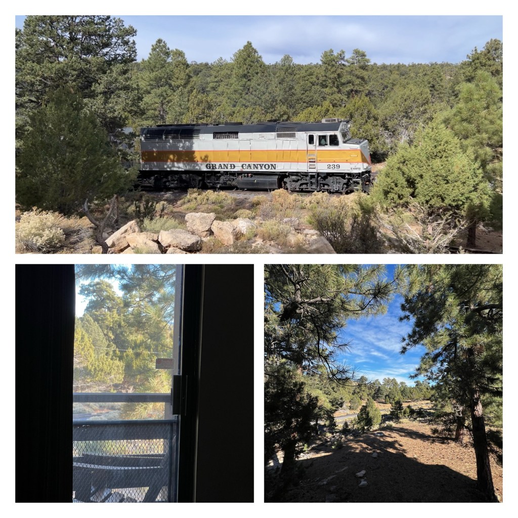 Andrew was still asleep, but I opened the curtains so I could see the pine trees outside. After a while Andrew stirred, I made coffee, and we forged plans for the day. The first plan was breakfast, which we had at Maswik Lodge. On previous trips, the only reasonable breakfast for a veggie like me was oatmeal. But it turned out they have revamped the menu and I was spoilt for choice! Hurrah! Omelette with tomatoes, peppers, mushrooms and onions, and potatoes, then. On our way back from breakfast it was nearly time for the train to arrive, so ‘nearly’, that I had to run to the railway line to video it. Someone near the front of the train waved at us, we waved back. The others in the train saw us waving and waved back…and so it was that we waved to almost everyone on the train.