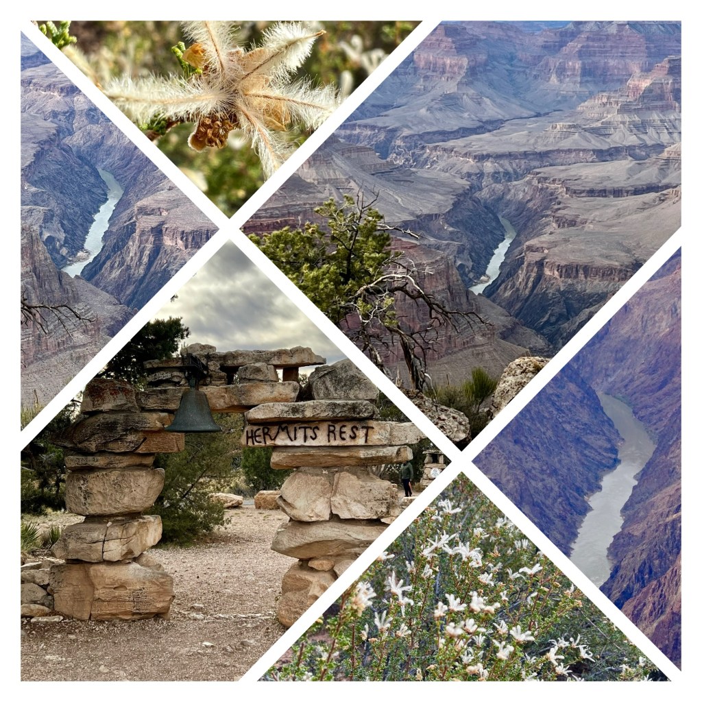 At Monument Creek vista we decided to skip the next section of trail. Whilst a lot of the trail up to that point is unsurfaced, and close to the edge (which makes it interesting and scenic) the next section to Pima Point is hard surfaced as part of the Greenway (suitable for bikes) and winds through woods away from the rim views. Given it is 1.8 miles long, and the least interesting section of the whole Rim Trail, we instead hopped on a shuttle bus that arrived just after we’d got to the bus stop. We got off at Pima Point and walked the last (surfaced) mile to Hermit’s Rest.