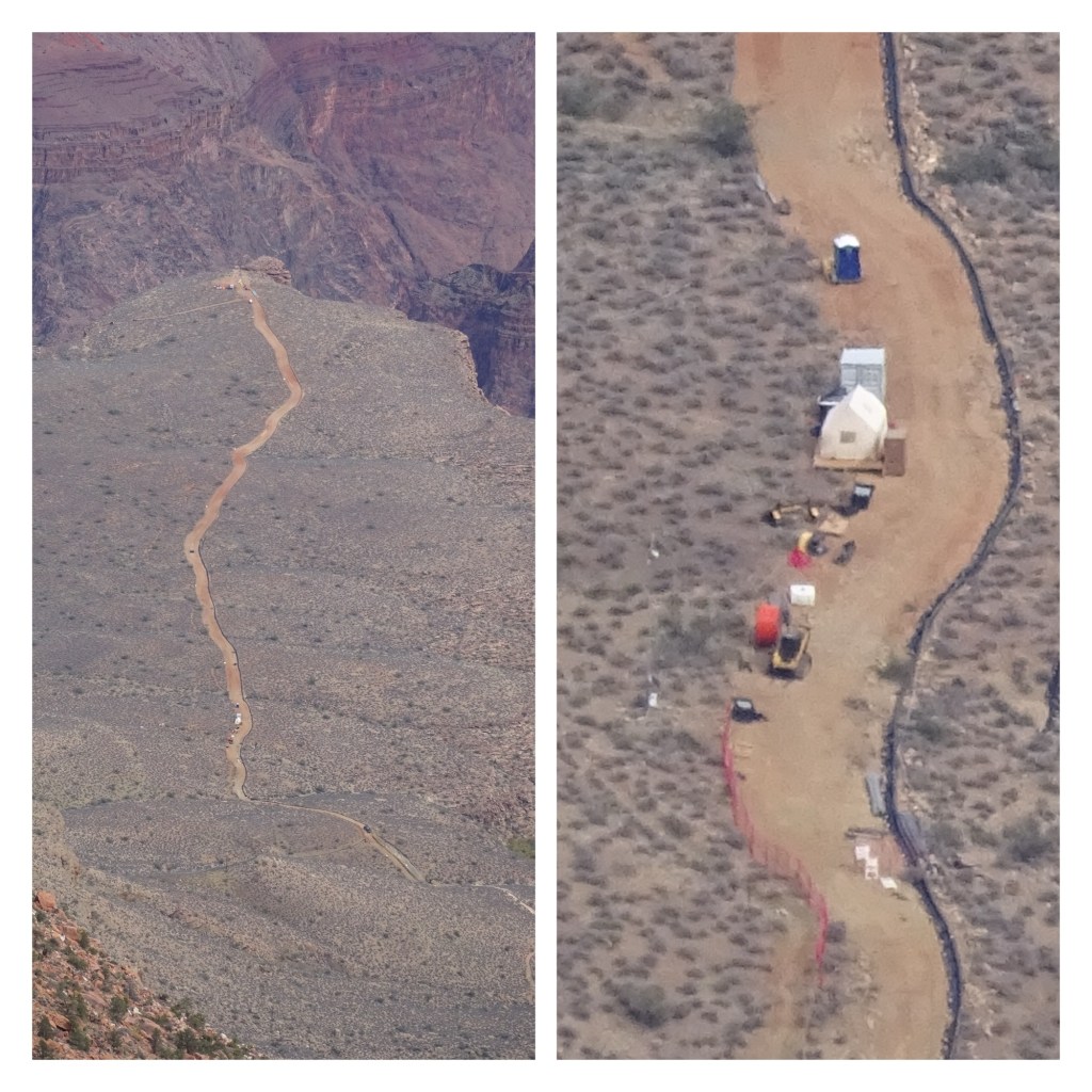 Back in the room we got our packs ready and then headed to the shuttle stop for the bus to Hermit’s Rest. Once there, however, there was a long queue of people, and we doubted that we’d even get on the first shuttle. A crowded bus wasn’t on my agenda. A change of plan, then. Instead of bussing to the far end and walking back, we’d start walking from this end and bus back. And so we did. As we climbed the first section to Trail View Overlook we could see works going on along Plateau Point Trail, to replace the trans canyon pipeline that brings water to the South Rim.