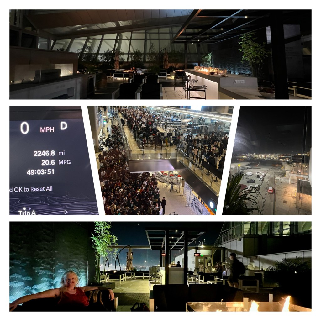 We went back to our room, had a coffee and some cookies, packed the last of our belongings into the cases (and despite my doubts, Andrew fitted everything back into his case), and then checked out of the hotel. We did the short drive to the rental car return at the airport (5 miles, 20 minutes, and the first and only time in the LA area that we hadn’t been in a big queue). We were on a shuttle bus which departed almost immediately, disembarking at Terminal 2. We had a reasonably smooth check in and trip through security, just a short queue and my bag got searched because my iPad confused the picture. We then had a 10 minute walk to the international terminal, which included crossing over the domestic security lines…this reminded us of Atlanta last year, and we were very glad not to be in that.