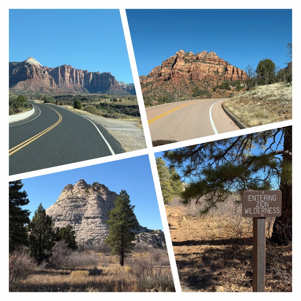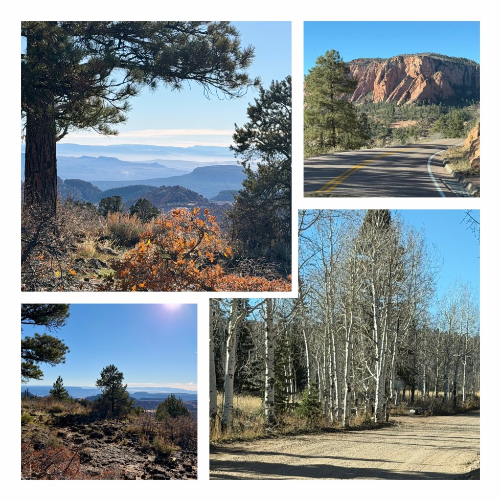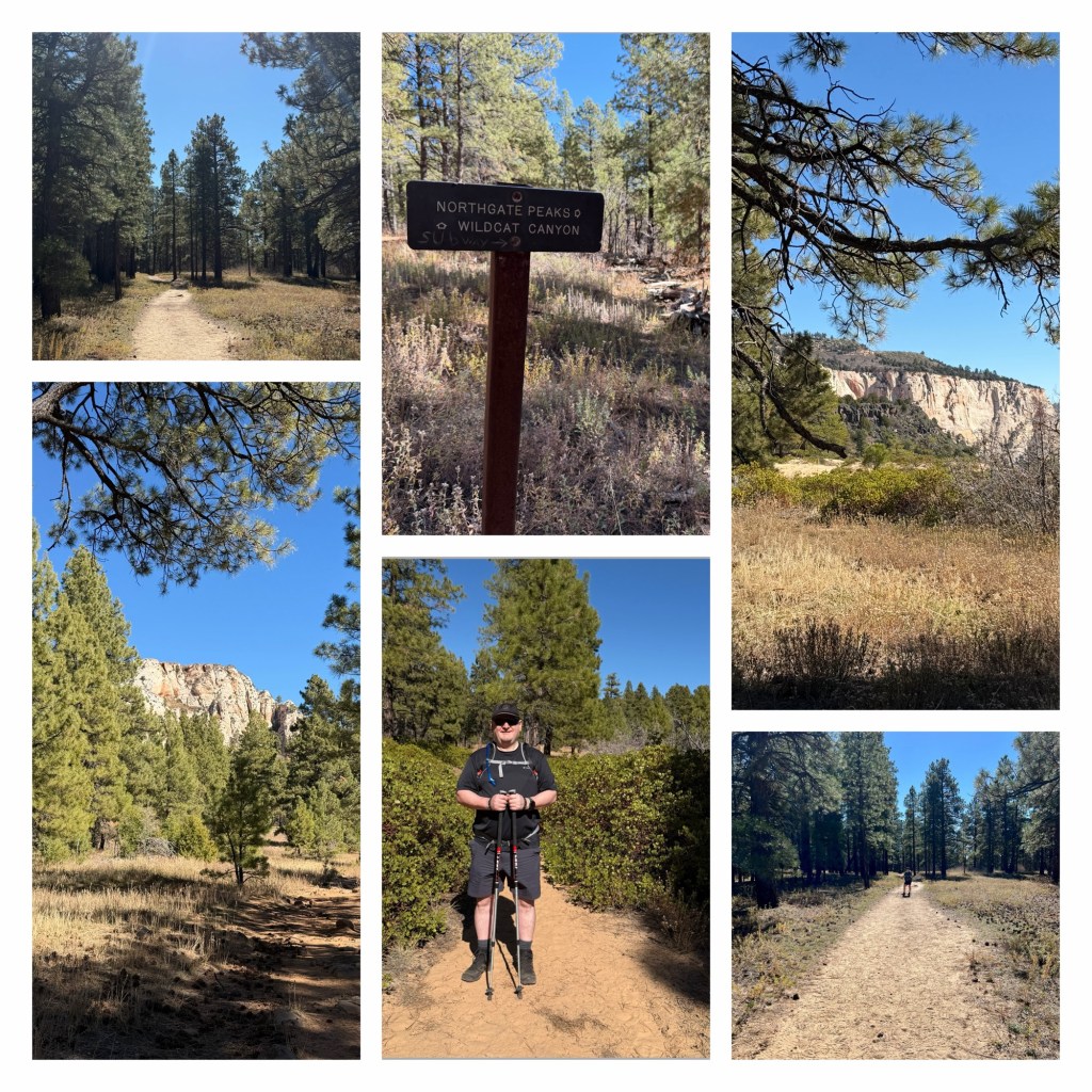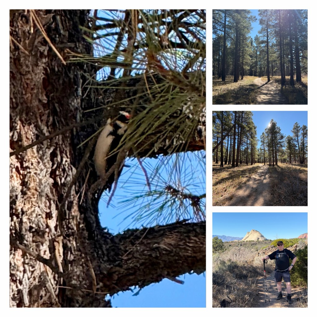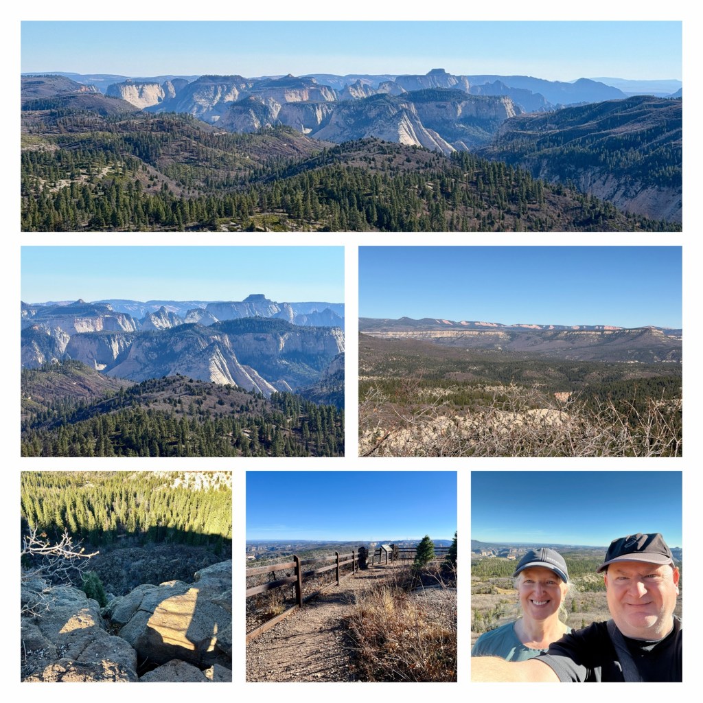 After eating we got ourselves ready as quickly as we reasonably could. Our original plan was to walk the Pa’rus Trail, but this would be in full sun, with very little shade and the temperature was already climbing. I changed the plan, and suggested the Northgate Peaks Trail. This is a 40 minute drive away, up the Kolob Terrace Road, ‘up’ being the key factor. At an altitude of nearly 7,000 feet, the air temperature was cooler, and the trail before from intermittent shade of pine trees. It was 66 degrees (19C) which was much more comfortable although the strength of the sun made it feel much warmer.