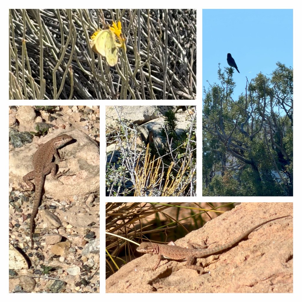 We got our boots on, packs on, and poles in hand, and set off from the car park. Shortly after that the trail divides into two. We could either go up the Wedding Canyon (primitive trail) or Monument Canyon (maintained trail). Not knowing how ‘primitive’ the former trail would be, we opted for option b. Within a short distance we had seen lizards (we would see many of those along the trail, mostly scuttling away to avoid our boots), blue jays (the silhouette is hard to tell, but the blue was apparent in flight), and a rabbit (spot the ears if you can, as it hid from the camera). There were also numerous butterflies about (clouded sulphur?).