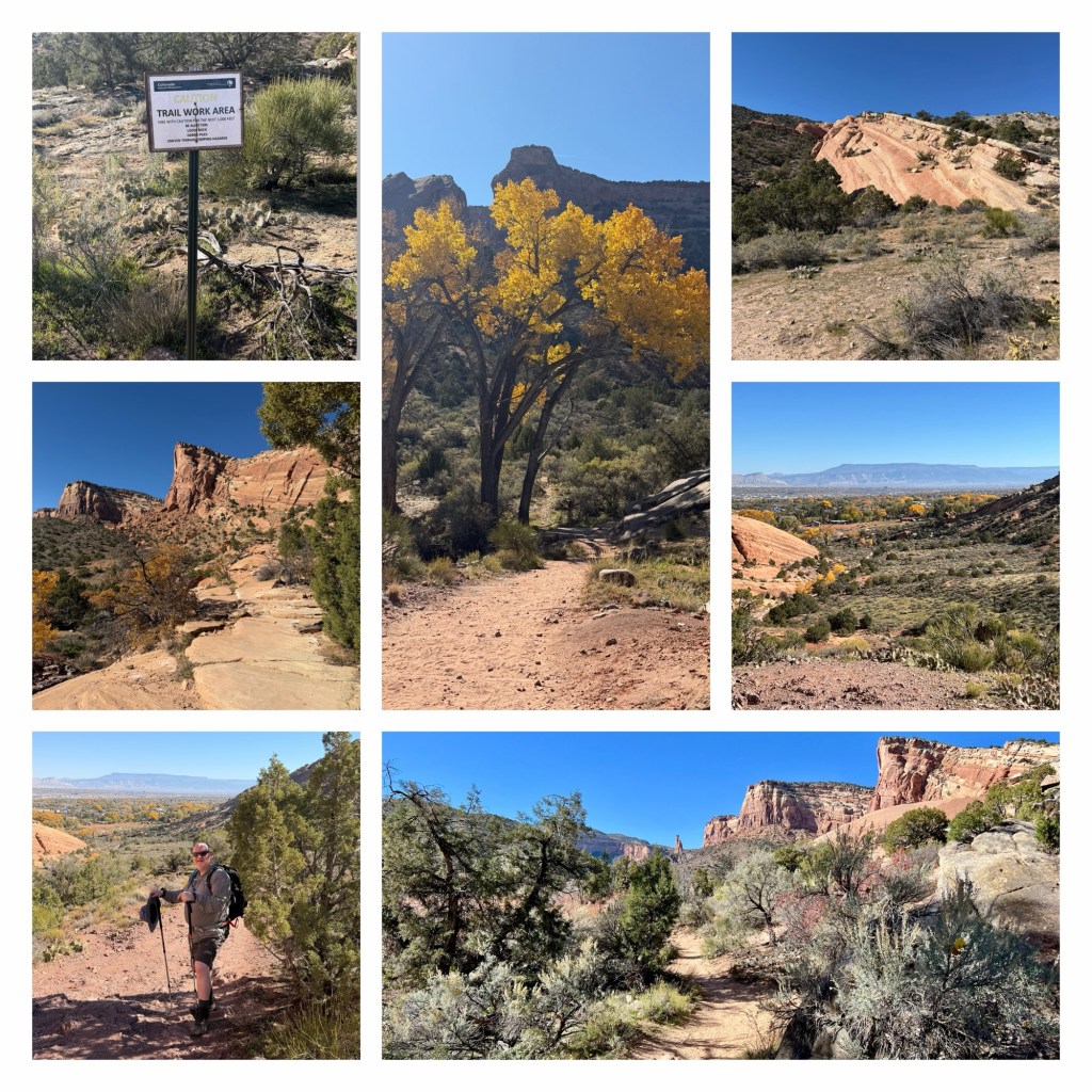 After about half a mile of following alongside fencing, and passing some large houses, the trail turned right, past some golden cottonwood trees, and started to climb up the canyon. Although the air temperature was pleasantly cool, the direct sun was hot. We both put sun shirts on, which helped, maintained an easy pace, and stopped for a break whenever there was any shade, which frankly wasn’t very often. Occasionally a juniper bush was tall enough to shade us, so progress tended to be made from tree to tree.