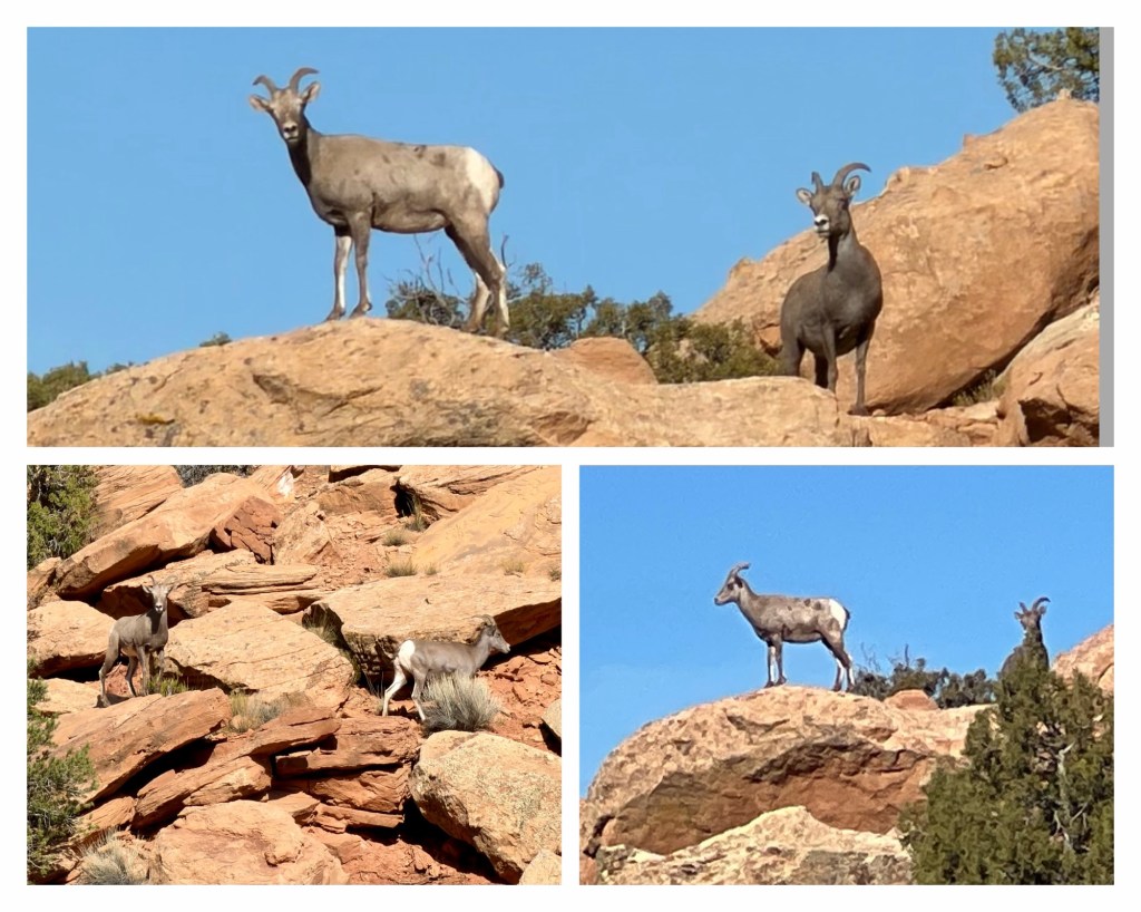 We ate our lunch bars and then got ready to leave, only to spot big horned sheep coming around the end of the canyon wall. There were six of them, seemingly as curious about us as we were about them. There were a lot more sure footed as they navigated the scree slope than we would be, though.