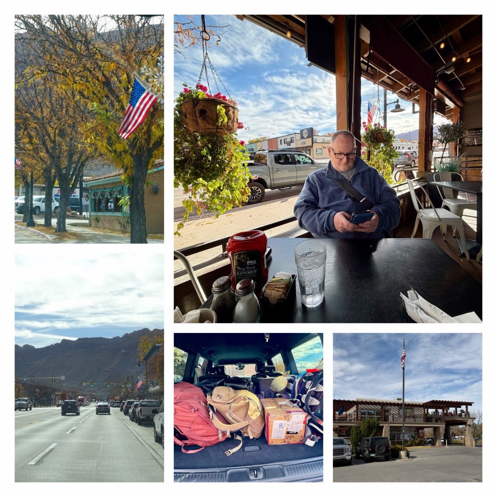 Having been a bit late getting up it was nearing 10.30am when we checked out, and after a very leisurely time over breakfast, out on the patio again, it was an hour later before we set off to get fuel, and then depart Moab. We noticed that Main Street had American flags up for Veteran’s Day (as did other towns we later passed through).