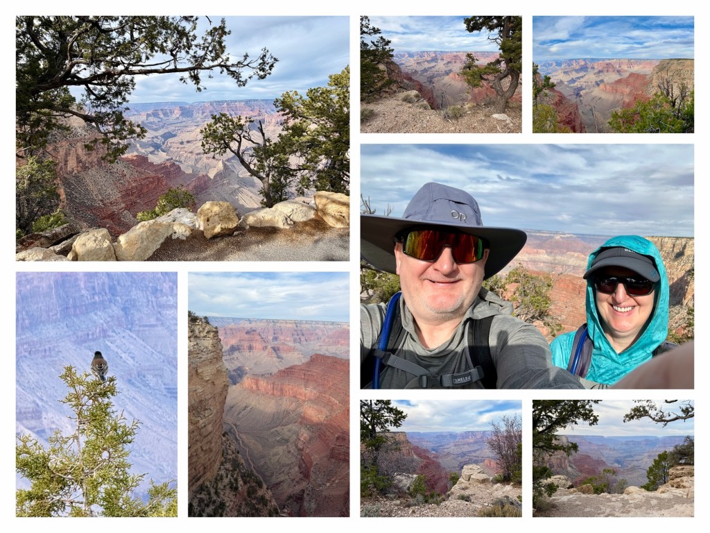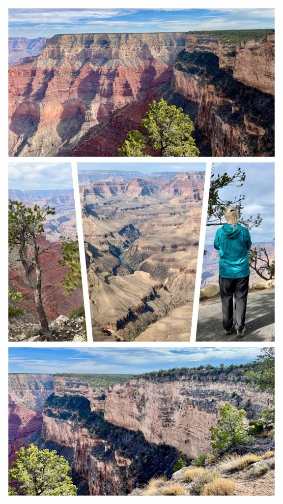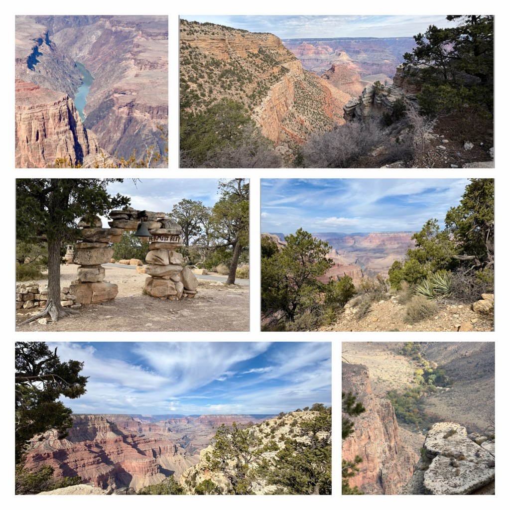 We made our way to the start of the Hermit Road and took the shuttle all the way to the end on the line at Hermit’s Rest, where we started hiking back. We ambled along, and did about half of this section of rim trail, just over 4 miles. The views speak for themselves…