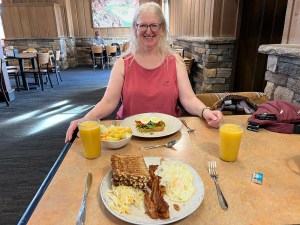 We went over to the lodge for breakfast, which is not generally an inspiring occasion for us veggies, but I was look forward to my oatmeal. There was a long queue at the counter that serves it (it does other things too, I’m not suggesting that the oatmeal is super popular), so I considered getting an omelette at the normal ‘cooked breakfast’ counter, where Andrew was headed. But then…I was tempted by the avocado toast, and a bowl of yoghurt, muesli and fruit. It not only all looked good, it tasted great.